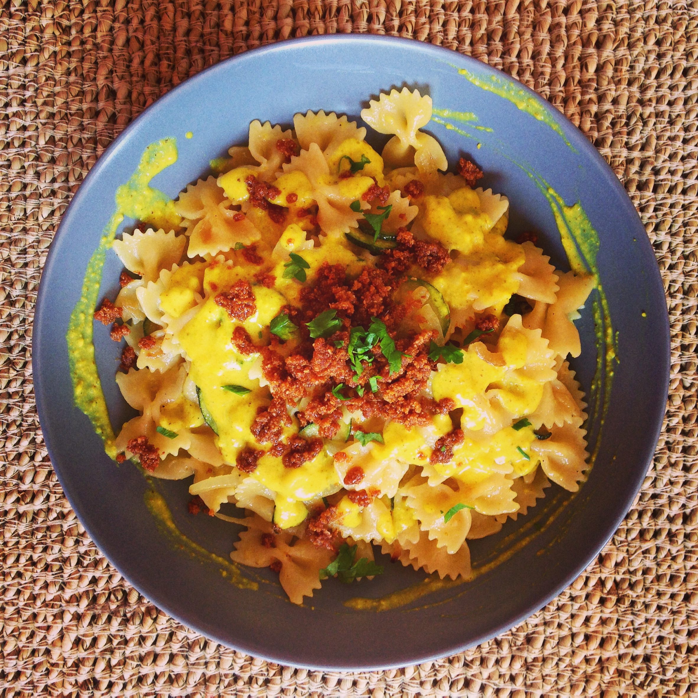 La serata di ieri ha creato numerose difficoltà nello svegliarsi, ma siamo riusciti a partorire anche oggi qualcosa di luculliano e sano, bhè sano forse no. Farfalle con zucchine e cipolla tutto in salsa di stracchino e curry e, per non farci mancare nulla, dell’ottimo pan grattato saltato in padella con un pò di olio d’olia.