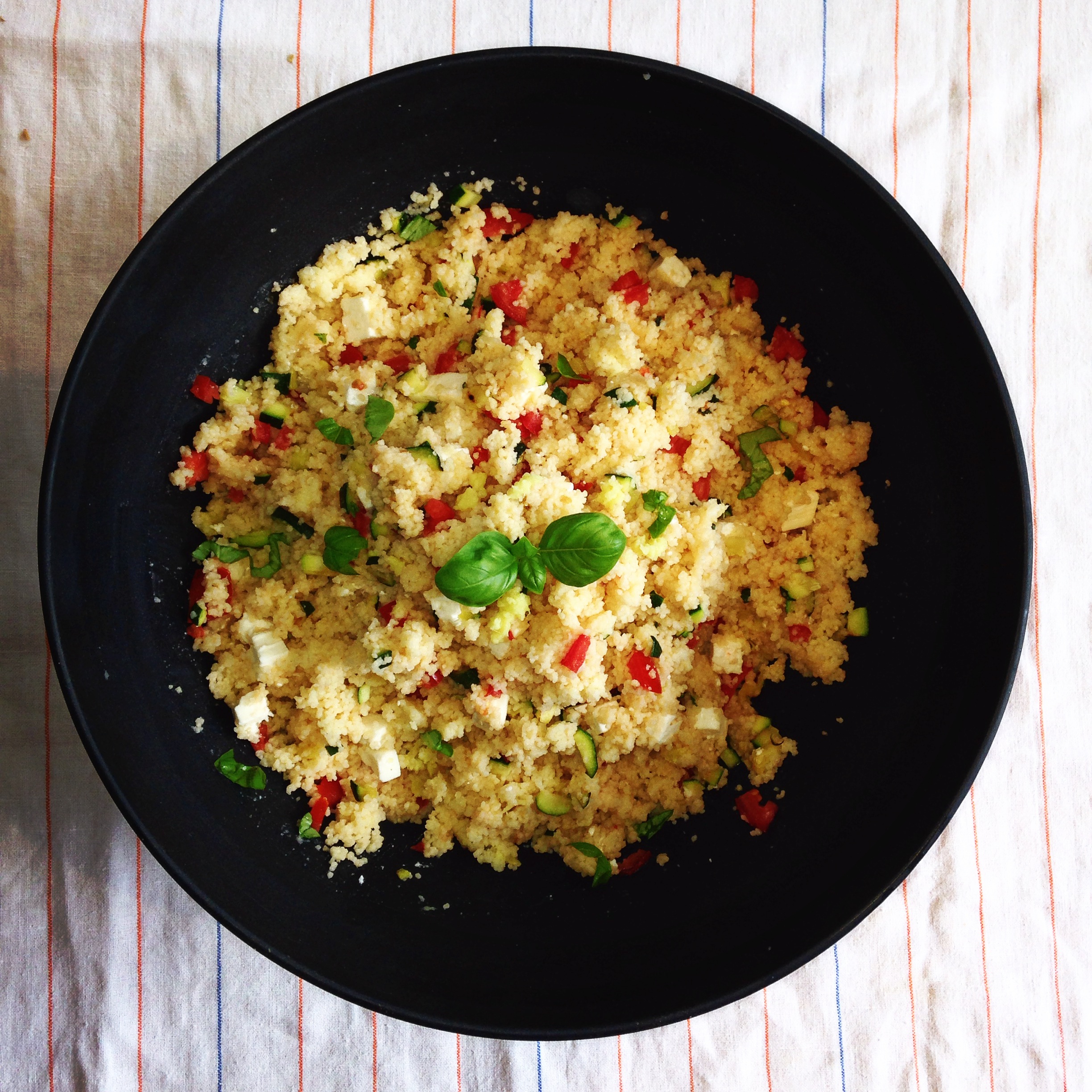 Il mondo del cibo non finisce mai di stupirci ed è stato un peccato scoprire le potenzialità di questo magico piatto solo all’ultimo anno. Il cous cous con la sua cottura quasi istantanea si presta a qualunque tipo di pranzo/cena sotto esame, si può condire con tutto quello che vuoi, è buono caldo e freddo. Oggi lo presentiamo alla nostra maniera, con quel che è in frigo: qualche pomodorino, della feta e delle zucchine.