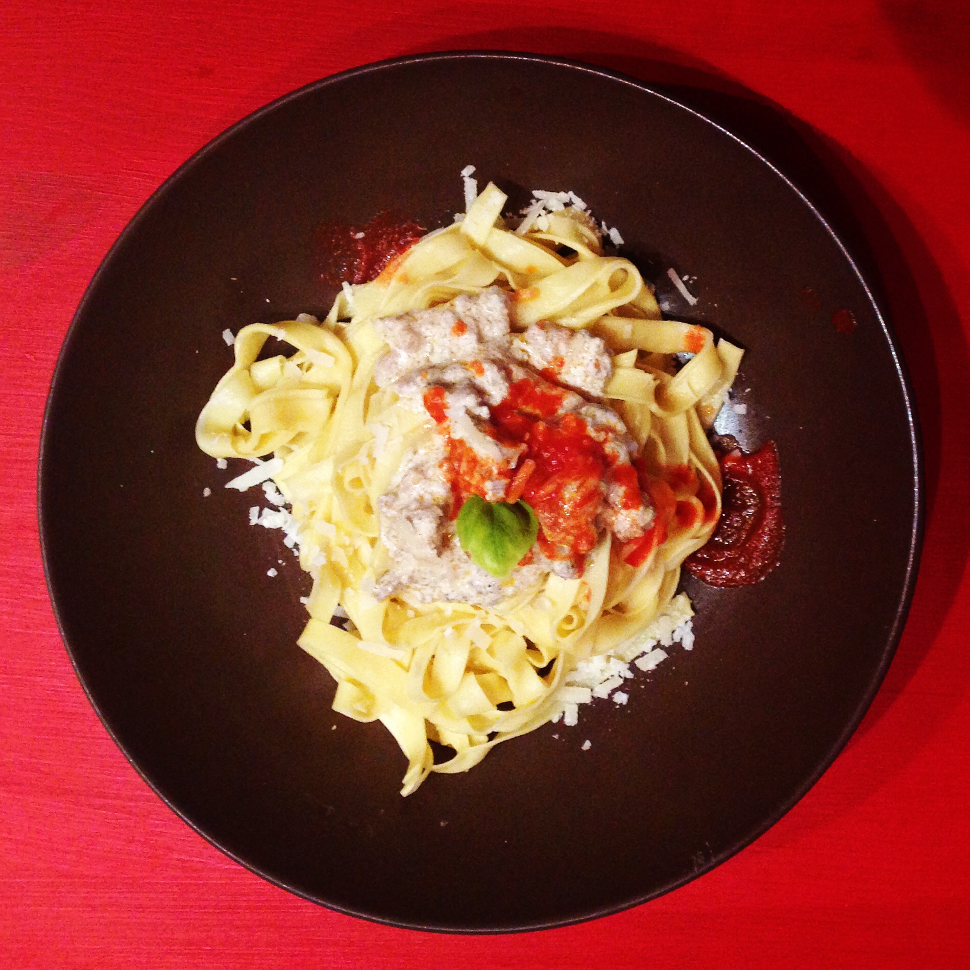La nostra amica Katie viene a trovarci da Berlino e la sera prima della sua partenza abbiamo pensato di farle assaggiare qualcosa di speciale. Dopo aver pensato a tutti i menu dei ristoranti di Ferrara, abbiamo pensato che avremmo potuto portarla noi stessi nel cuore della cucina all’italiana. Armati della nuova Imperia, regalo della gentilissima mamma Fiorenza, abbiamo fatto le tagliatelle in casa e non sapendo scegliere tra una classica salsa di pomodoro e del sugo salsiccia, funghi e panna, li abbiamo fatti entrambi.