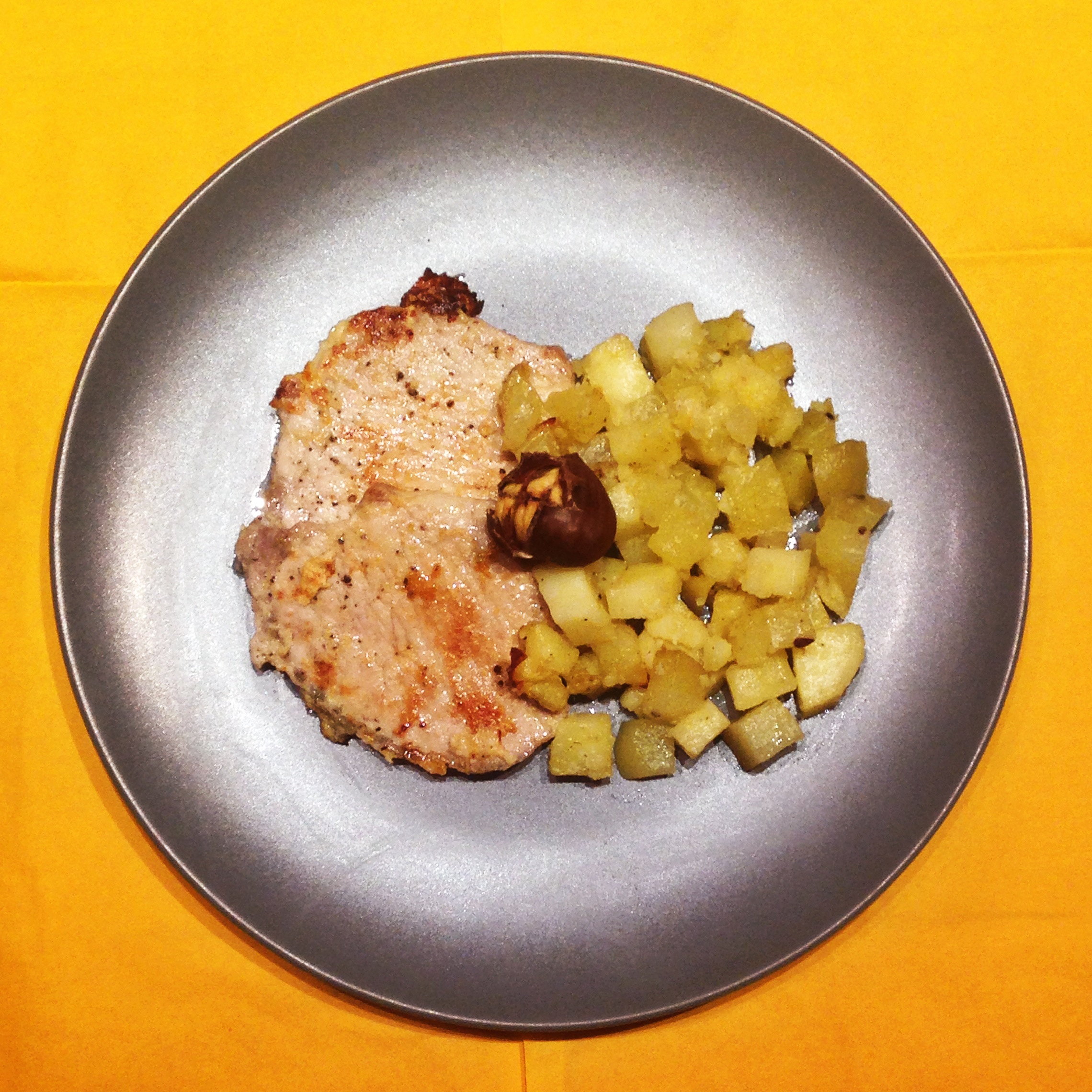Ingredienti principali | 4 fettine di Maiale, 10 Castagne, 4 Patate medie