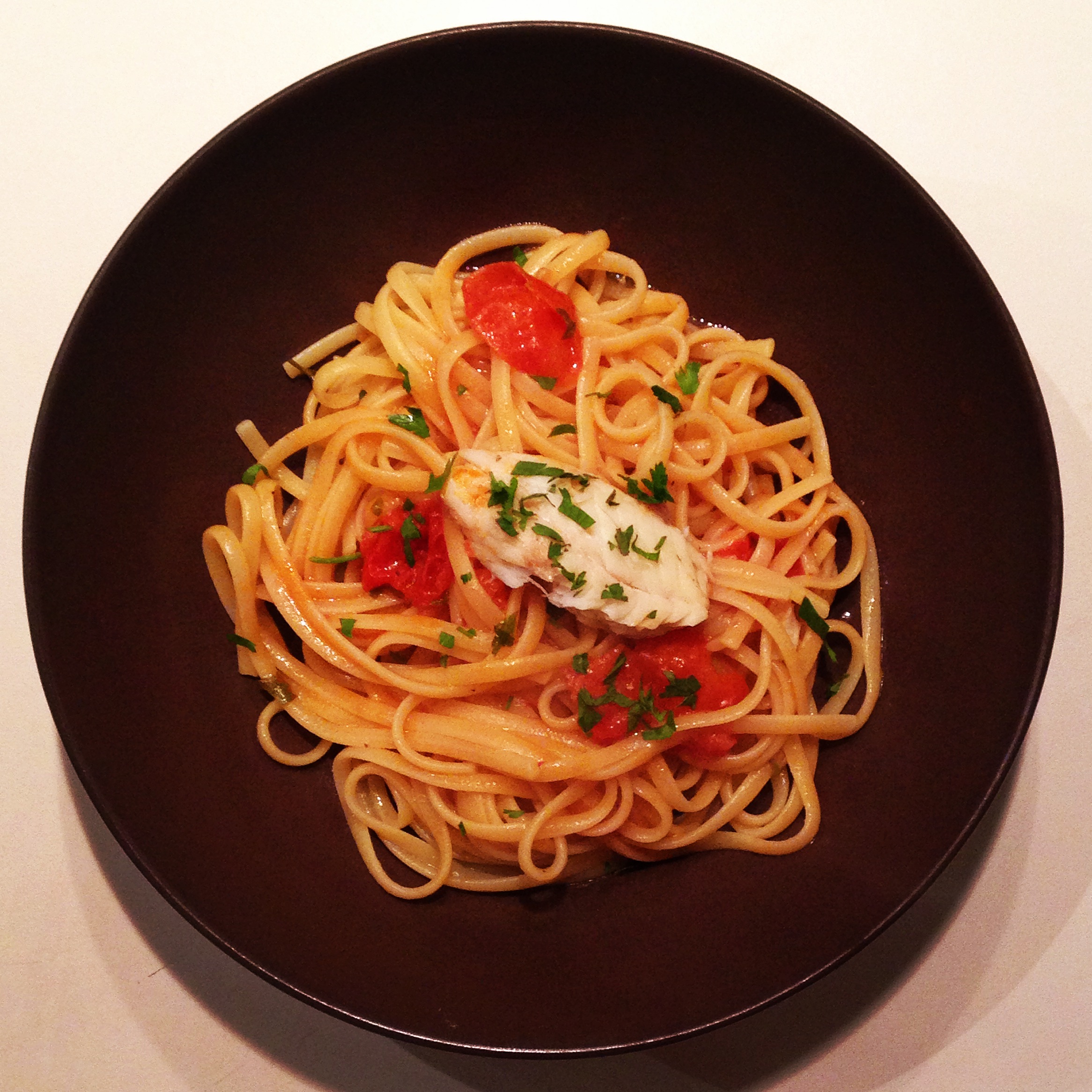 Ora con tutta la calma del mondo, mentre cuocete le fettuccine nel metodo più tradizionale (acqua che bolle, calo la pasta e butto il sale, scolo al dente), prendete il pesce e iniziate a pulirlo con amore. Togliere la pelle, la testa, e tutte le spine, cercando di lasciarlo il più integro possibile. Il fragolino non ha molte spine, quindi state sereni se non riuscite a ricomporre tutta la lisca. Scolata la pasta, insaporitela saltandola in padella con il sugo e i pomodorini per poi servirla con tranci di pesce in cima e una spolverata di prezzemolo tritato.