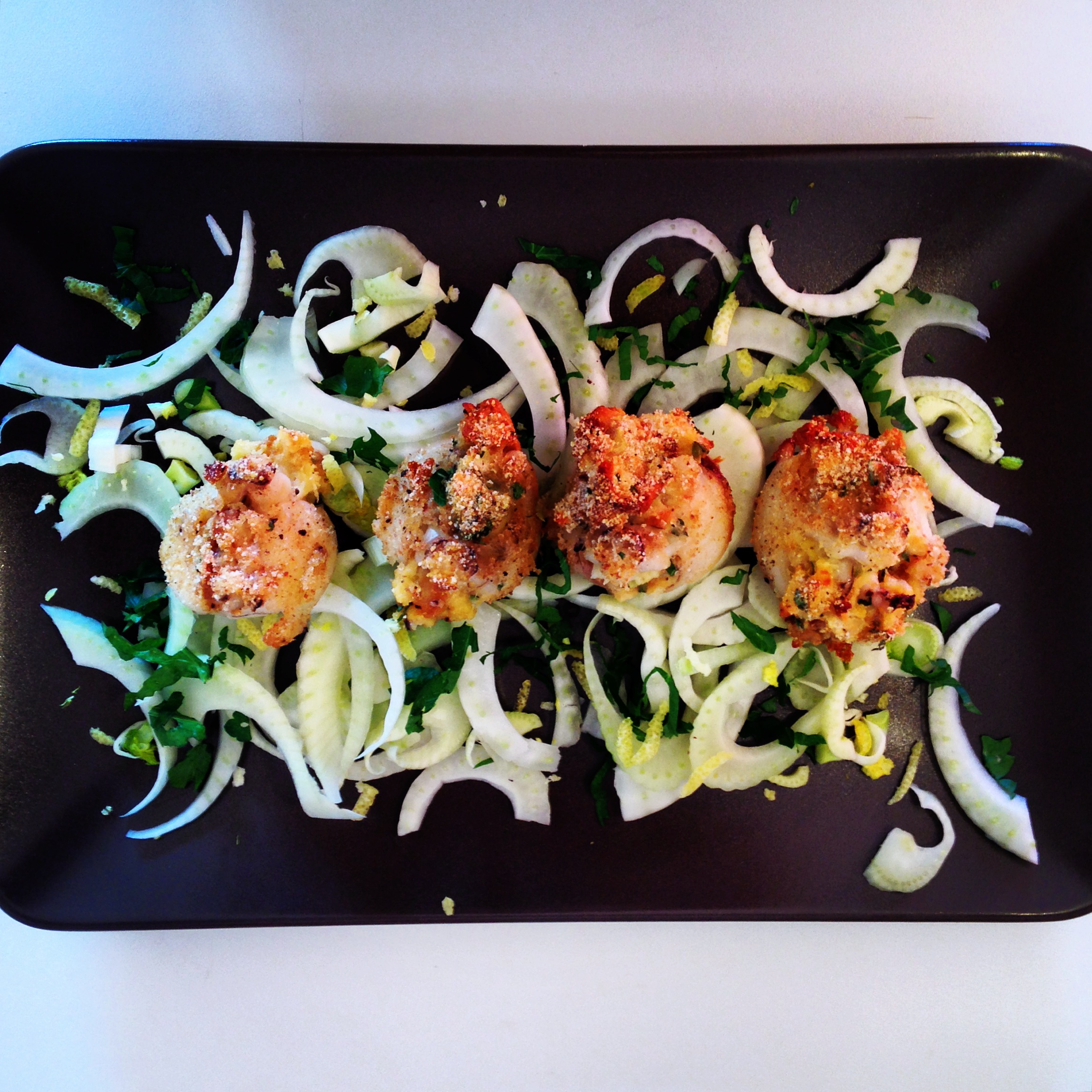 Per ricreare la scenografia, tagliate i finocchi seguendo la linea orizzontale e distribuirli con apparente casualità sul piatto. Grattate della scorza di limone per donare freschezza al piatto e aggiungere del prezzemolo tritato. Posizionare le seppioline ripiene al centro e contare quanti secondi ci metteranno a sparire tutti. Op, op, op. Noi ne avremo impiegati 10|